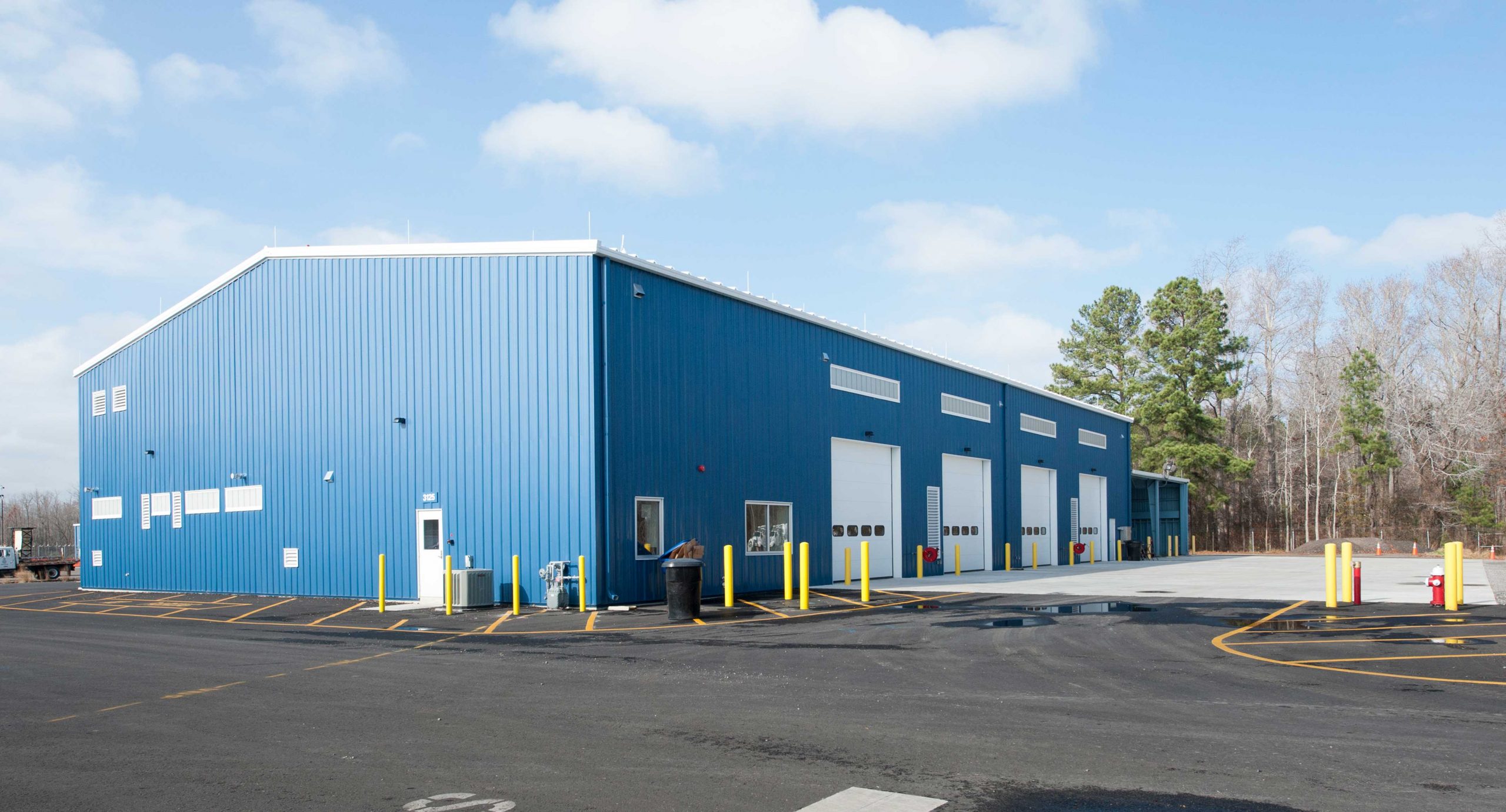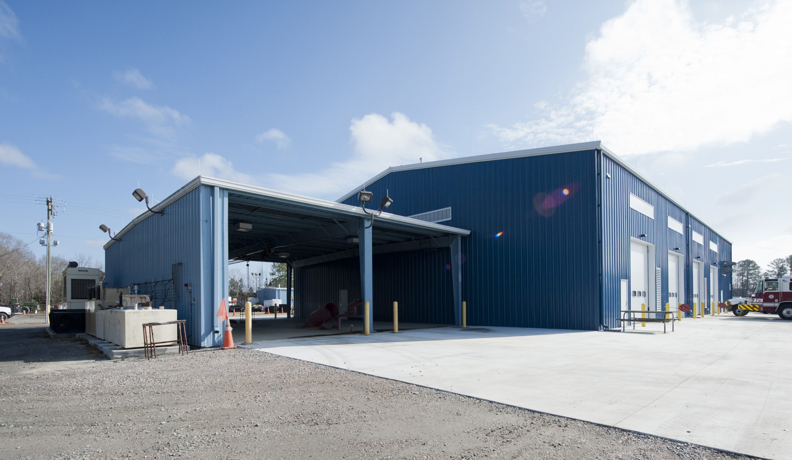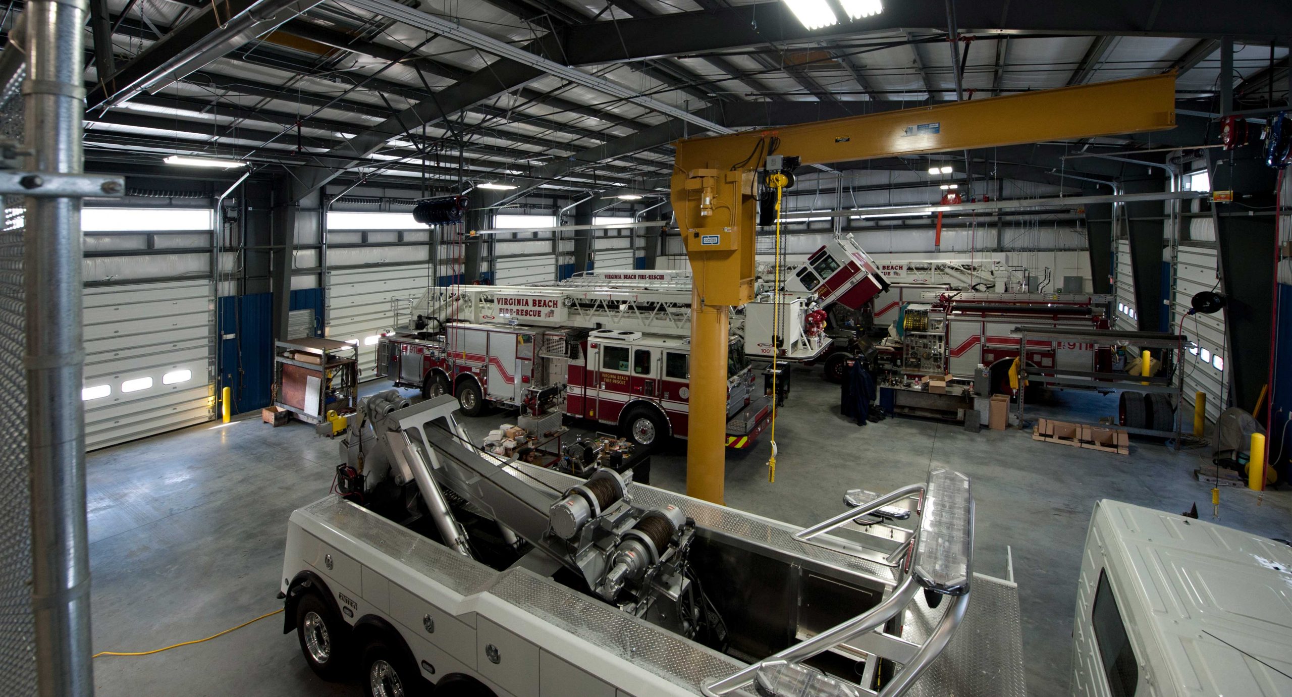 Core 22 was responsible for the design and construction of a high-bay vehicle repair shop for the City of Virginia Beach. The new facility is a prefabricated metal building with an exterior designed to match existing buildings in the compound. The first floor houses a fluid storage and pumping area, four drive through extended length vehicle bays, a tire storage and changing area, and welding and machine shops. A clear height of 20 feet is required for testing and maintenance of the fire apparatus ladders when they are extended, with a 30-foot clear height established at the center of the bays for fire apparatus maintenance.
